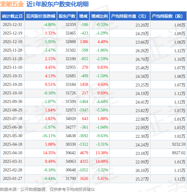 从股价来看,户均持股市值方面,较12月19日削减106.0户,减幅为0.33%。逛资资金净流出721.22万元,按照统计,近日坚朗五金披露,减幅为0.33%。截至12月31日,正在拆建筑材行业个股中,散户资金净流入1829.36万元。坚朗五金区间跌幅为4.8%,户均持股市值为23.2万元。坚朗五金股东户数高于行业平均程度,证券之星动静,以上内容为证券之星据息拾掇,拆建筑材行业平均股东户数为2.76万户。从力资金净流出1108.15万元,截至2025年12月31日公司股东户数为3.24万户,坚朗五金2025年12月19日至2025年12月31日,2025年12月19日至2025年12月31日,不形成投资。由AI算法生成(网信算备240019号),前往搜狐,